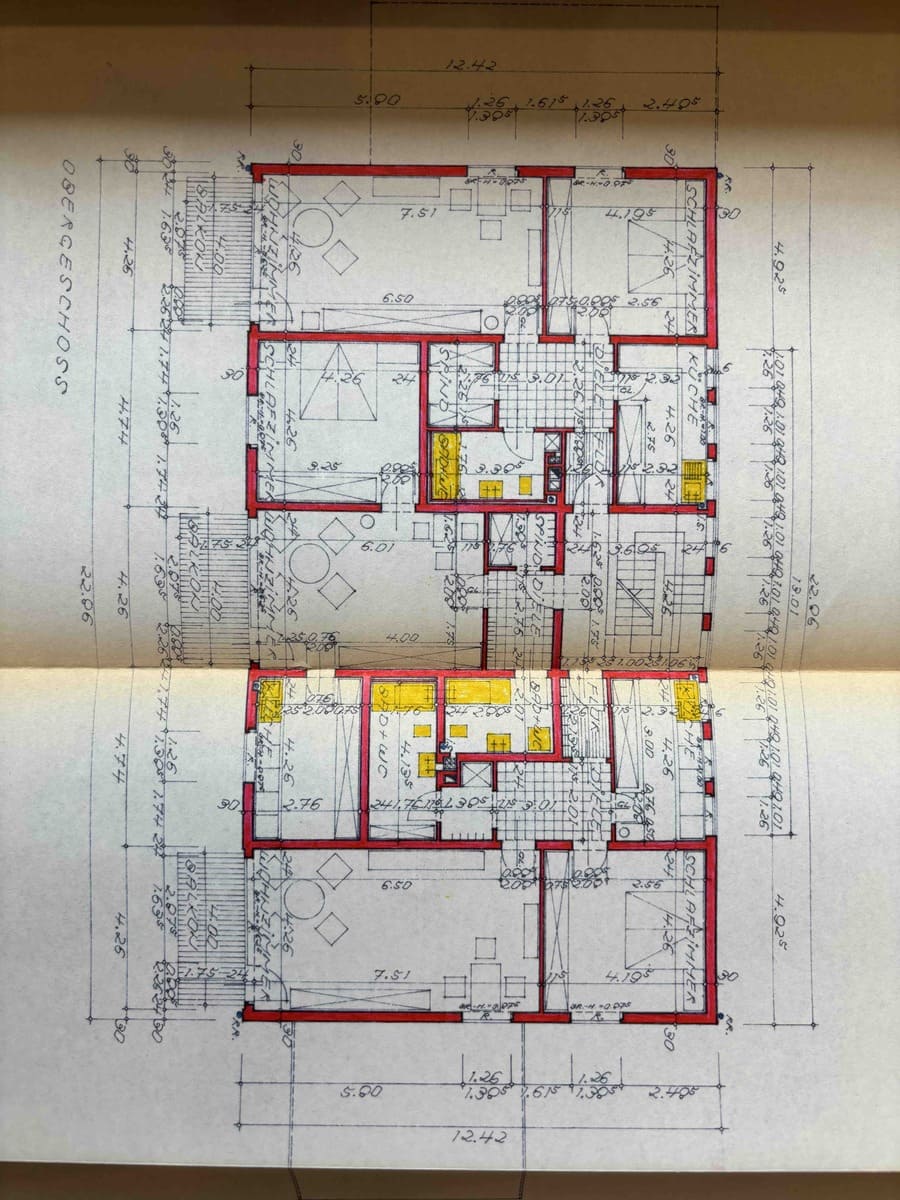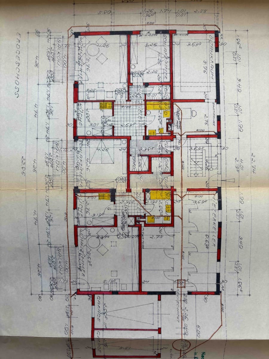 Dieses äußerst massive, solide und funktional gebaute Mehrfamilienhaus verfügt über helle, mit zweckmäßigen  Grundrissen ausgestattete Wohnungen und insgesamt ca. 600m² Wohnfläche. (bebaute Fläche Wohnhaus 184m² und Garagen 36m²)