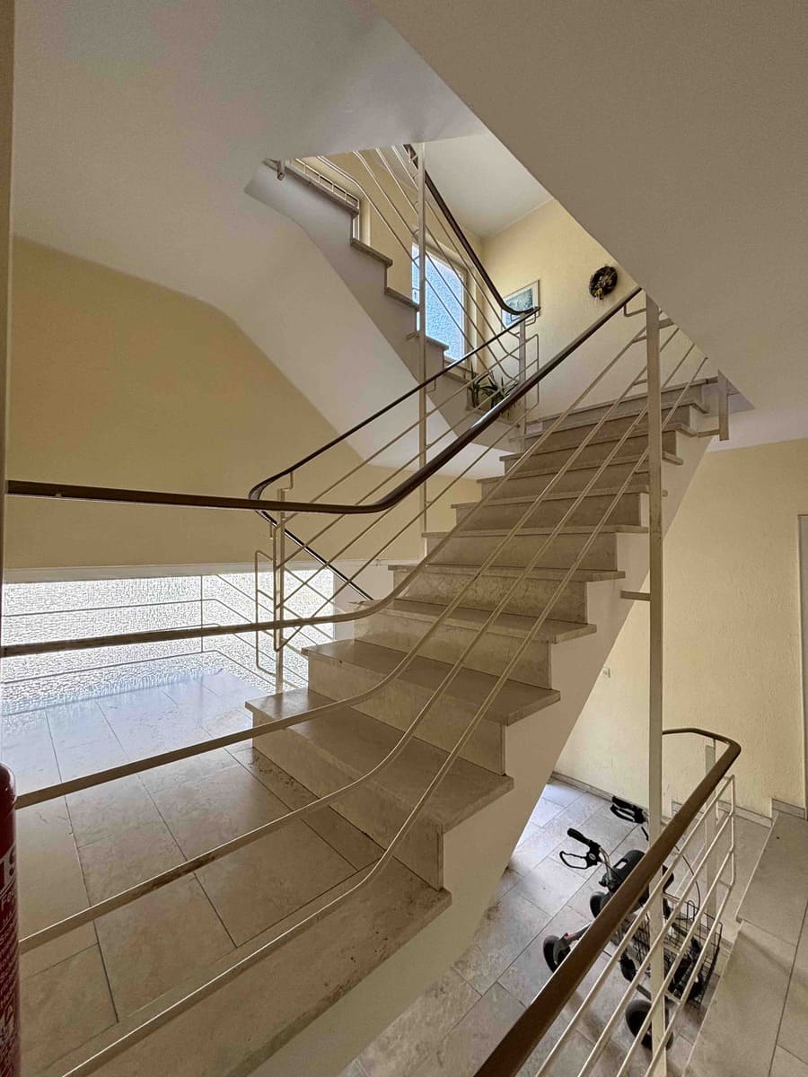 Das Treppenhaus wirkt durch die hellen Natursteinbodenbeläge edel und freundlich und ist in tadellosem Zustand.